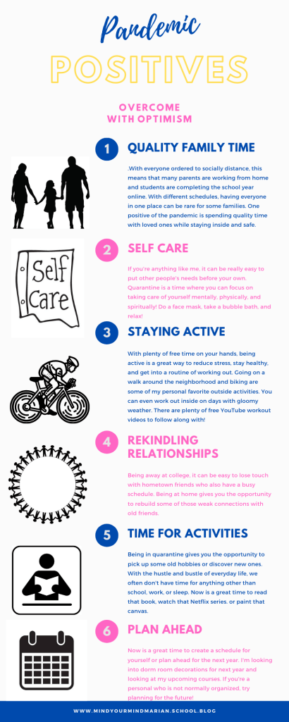 In the midst of a global emergency, it can be easy to fall into a negative mindset about the situation. While it is normal to be upset about a sudden change in lifestyle and adapting to a new schedule, having a positive attitude can alleviate stress and improve quarantine conditions. In this infographic, I have provided some ways to look at some positive aspects of the pandemic. Quarantine is what you make it, so make it an productive experience!
